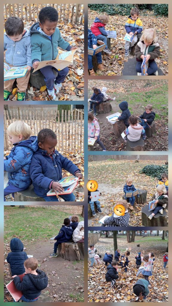 Et pourquoi pas lire au parc? Le Lycée a ouvert son parc à nos petits d’Accueil et de M1 de Mme Paula.