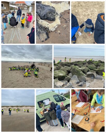 Utilisation de filets, construction de châteaux de sable, créer ensemble, écriture des cartes aux parents, embellir la cour du centre pour y laisser une trace, observation de notre récolte de la chasse au trésor, dégustation de glace 🍦