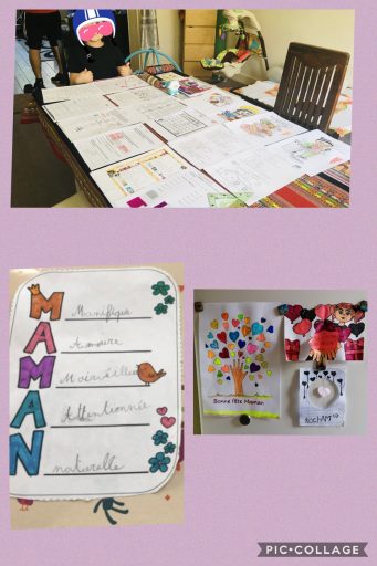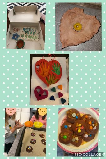 Des mamans gâtées ce week-end en P1/P2: Dégustation de délicieux mendiants et œuvres en pâte à sel. Le défi de la ligne du temps a aussi été relevé avec succès.