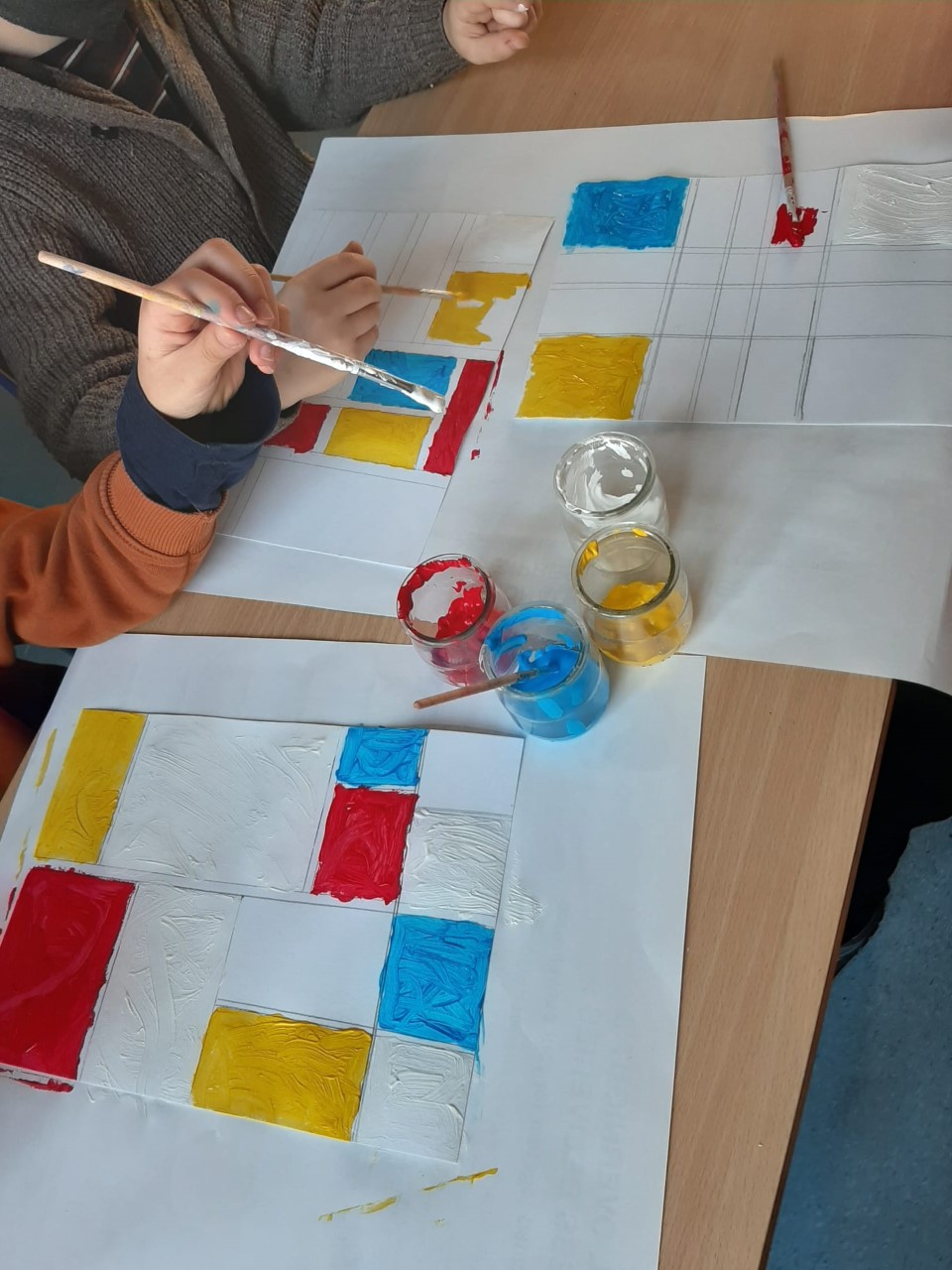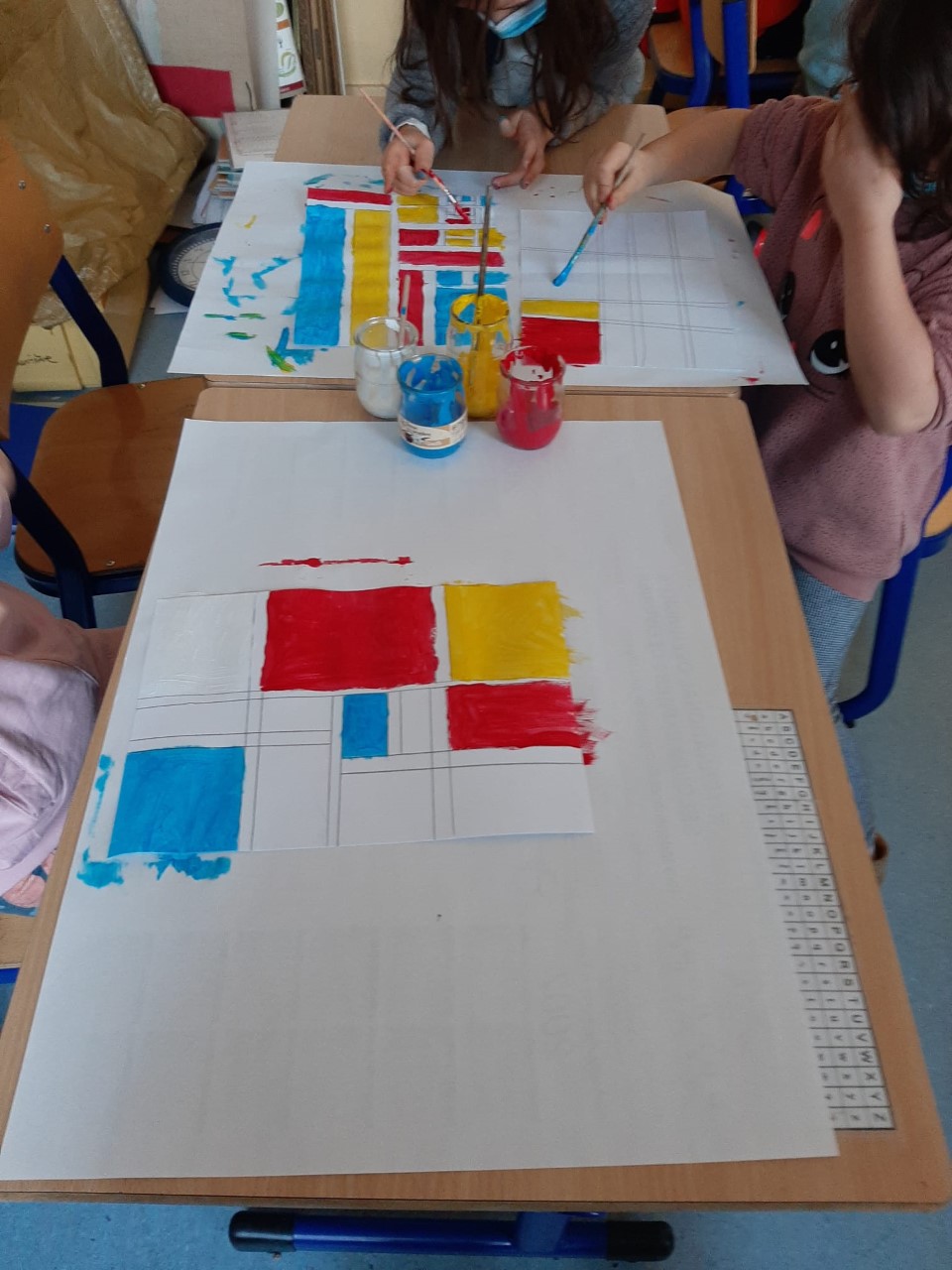 L’œuvre de Piet Mondrian (le maître de la ligne droite, du quadrillage et des couleurs primaires) a guidé les élèves de la classe de Mme Geneviève dans leurs réalisations.