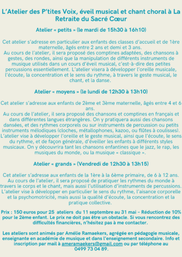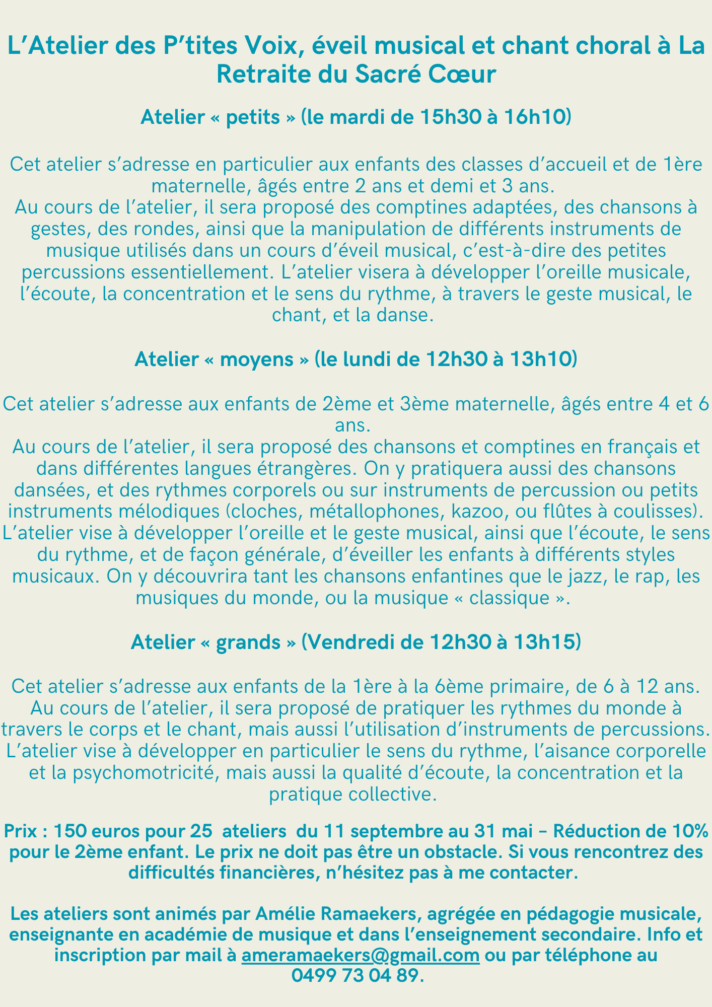 Madame Amélie Ramaekers, agrégée en pédagogie musicale, enseignante en académie de musique et dans l’enseignement secondaire, vous propose ses ateliers musicaux.