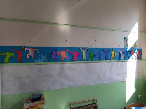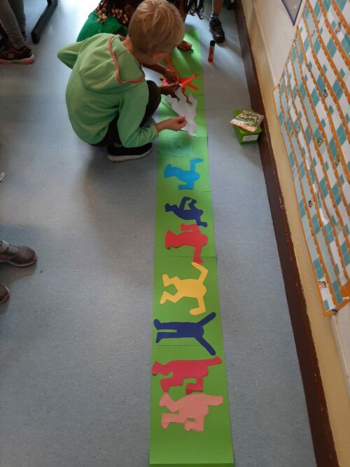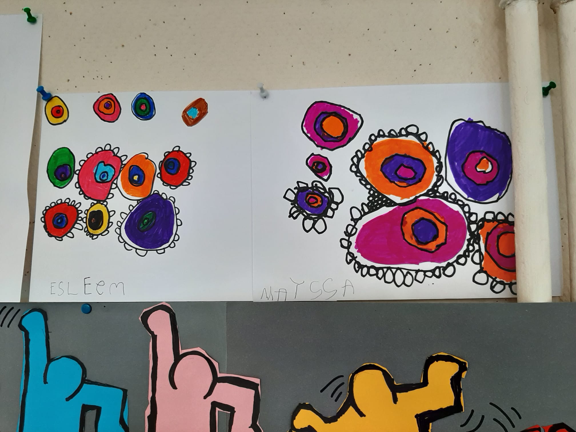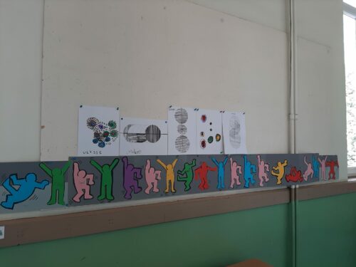 À la manière de Keith Haring, peintre, dessinateur et sculpteur américain des années ’80, les enfants ont choisi reproduit et souligné des silhouettes aux couleurs vives. Les œuvres collectives réalisées décornent nos classes et le couloir!