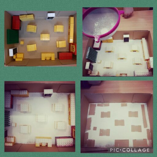 Pour terminer l’activité, de la farine a été tamisée sur une maquette en Lego pour ensuite retirer les blocs. Le plan de la classe est alors apparu.