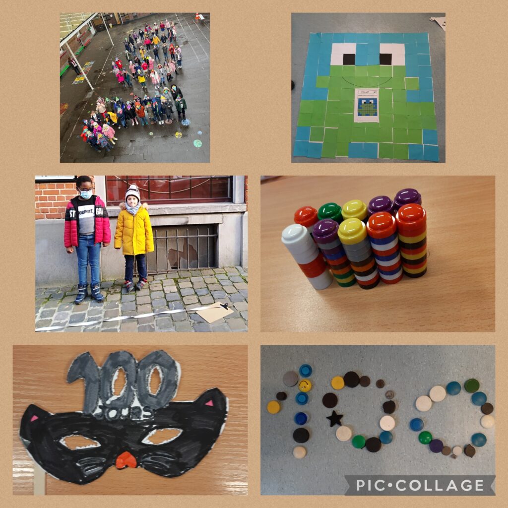 Chaque matin depuis le 1er septembre,nous comptons les jours d’école. Lorsque le 10ème jour est arrivé,nous avons constitué notre première dizaine. Et le 16 février,nous avons fêté le 100ème jour d’école. Une matinée remplie de défis : des collections de 100,un pixel-art géant,se peser pour obtenir 100 kilos,mesurer 100 mètres dans la rue…