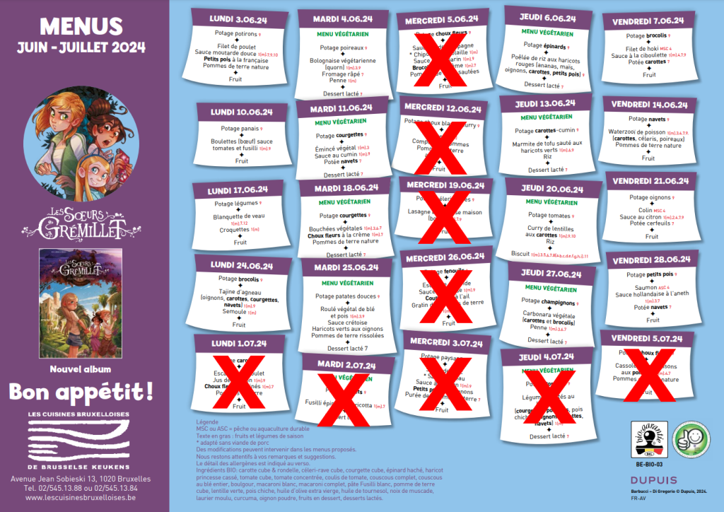 Voici le menu du mois de juin, pour rappel il n’y a pas de repas chaud le mercredi.Il n’y aura pas non plus de repas chauds durant la première semaine de juillet.