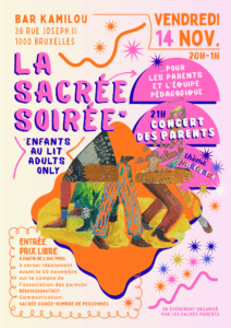 L’association des parents de la Retraite du Sacré-Cœur « les sacrés parents » vous invite à la « Sacrée soirée » organisée le 14 novembre dès 20h, pour les parents et l’équipe pédagogique de l’école. A cette occasion, un orchestre de parents musiciens de l’école donnera son premier concert, suivi d’un DJ set. Infos:  Start 20h, Concert 21h, DJ Set 21h30, End 1h du matin Bar Kamilou, Rue Joseph II 36, 1000 Bruxelles Thème Paillettes Adults Only Entrée: prix libre à partir… lire la suite…
