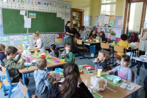 Ce mercredi 22 mai, tous les enfants de l’école ont déjeuné ensemble dans les classes. Les classes primaires et maternelles étaient mélangées, les grands ont pu aider les plus jeunes à faire leurs tartines, ont servi les boissons… Une belle activité de Vivre Ensemble! Au menu : des produits wallons : jus de pomme artisanal,lait, pain gris et pain blanc avec beurre, confiture ou fromage, yaourt, pommes et poires. Ce petit déjeuner est organisé chaque année grâce au au soutien de l’Apaq-W. Merci à eux.