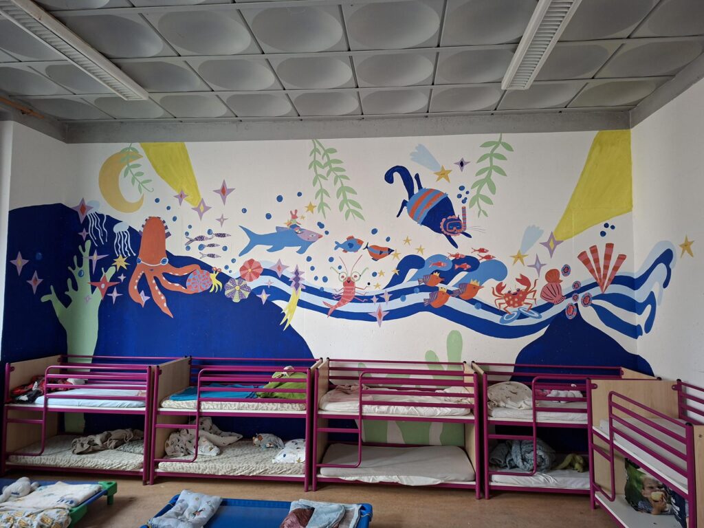 De petites mains magiques sont venues ce we pour rendre notre salle de sieste magnifique! Un tout grand merci à l’AP pour son investissement ! Grâce à vous, nos petits rêveront à un monde aquatique où la sérénité et la créativité feront « bon ménage ».